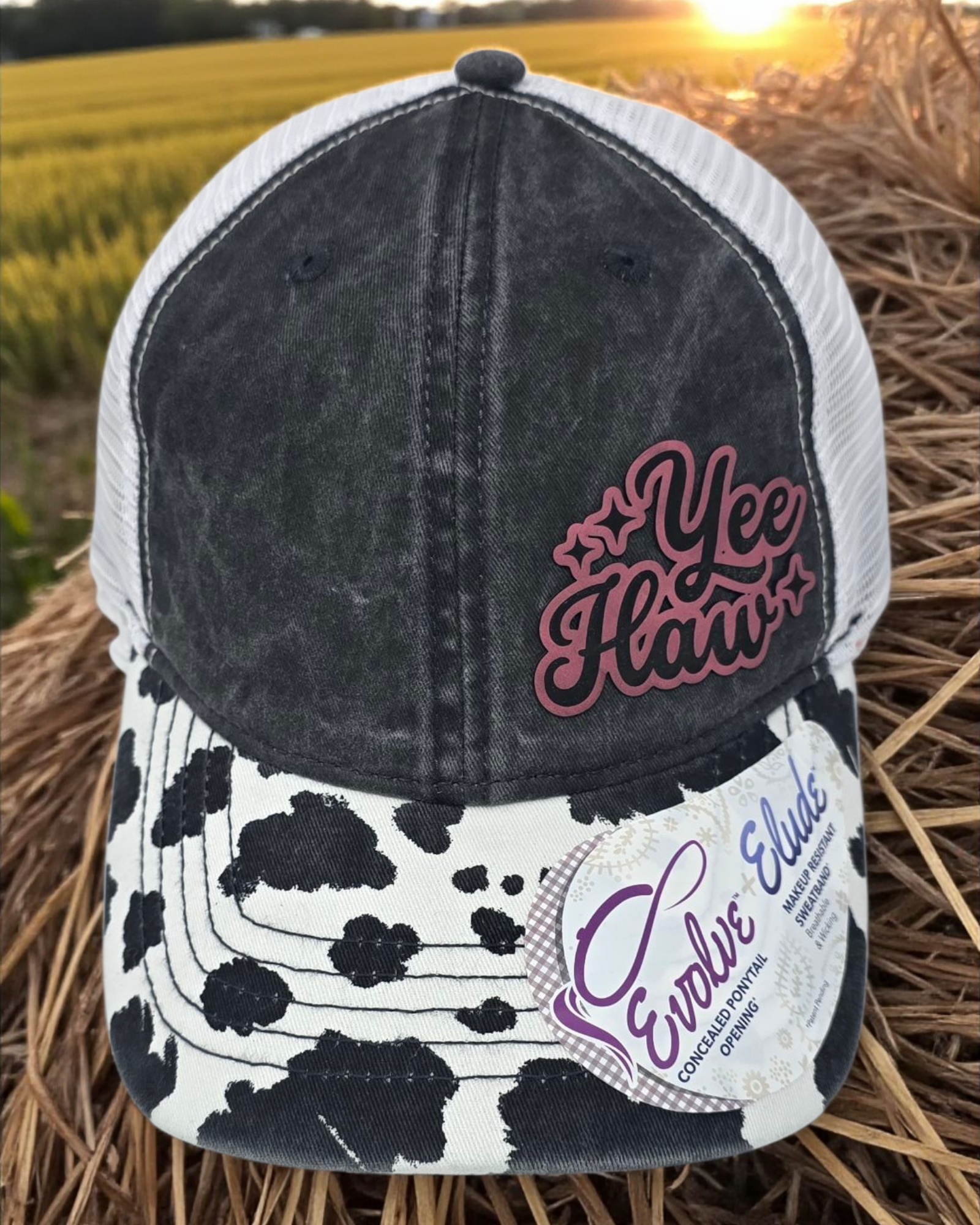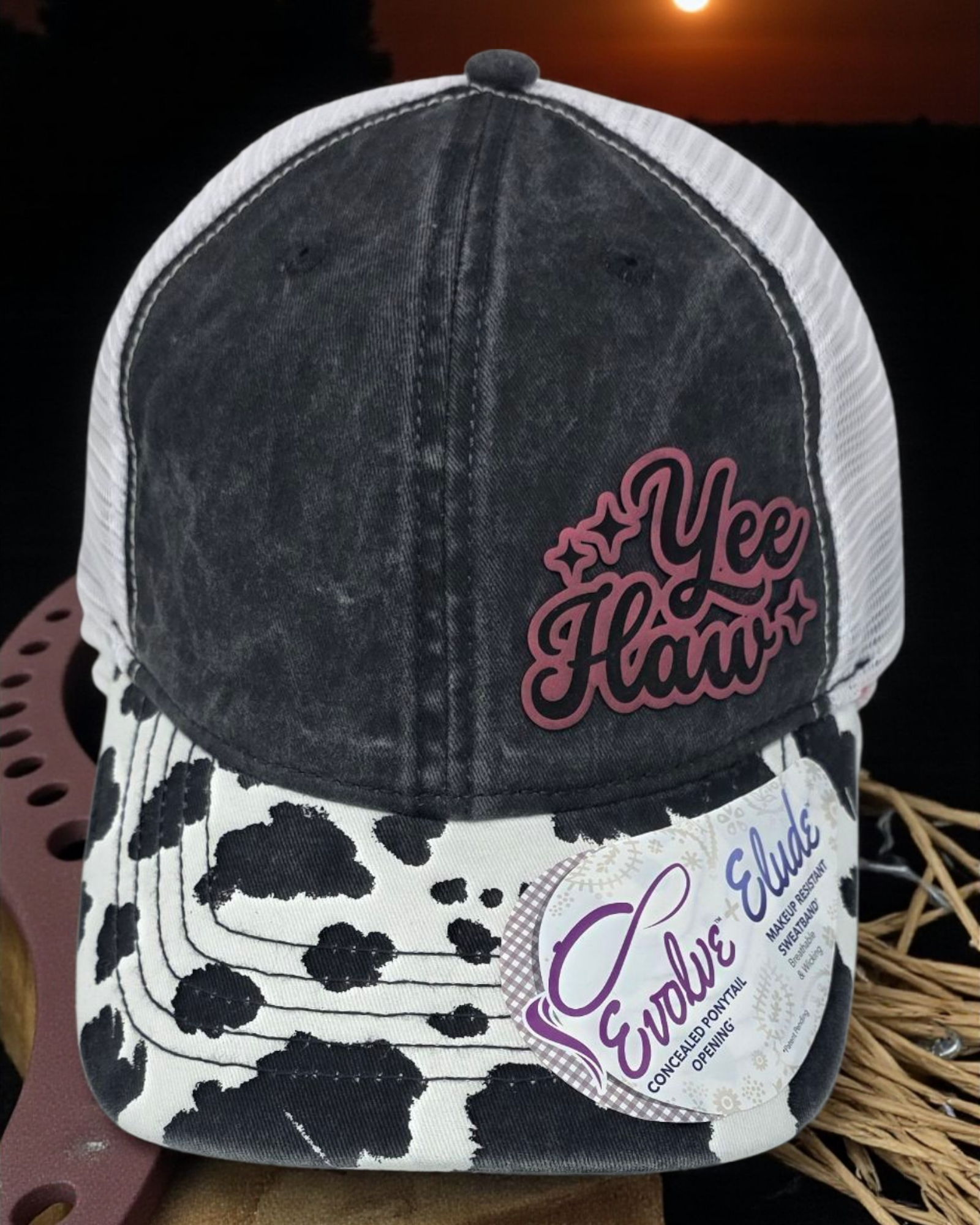 Bring a bold western vibe to your look with this cow print trucker hat featuring a striking laser-engraved "Yee Haw" on pink leatherette. The distressed black front panel adds rugged character, while the white-and-black cowhide print brim keeps it fun and eye-catching. Finished with a breathable mesh back and adjustable fit, this hat is perfect for rodeos, ranch life, or simply showing off your country spirit in style.