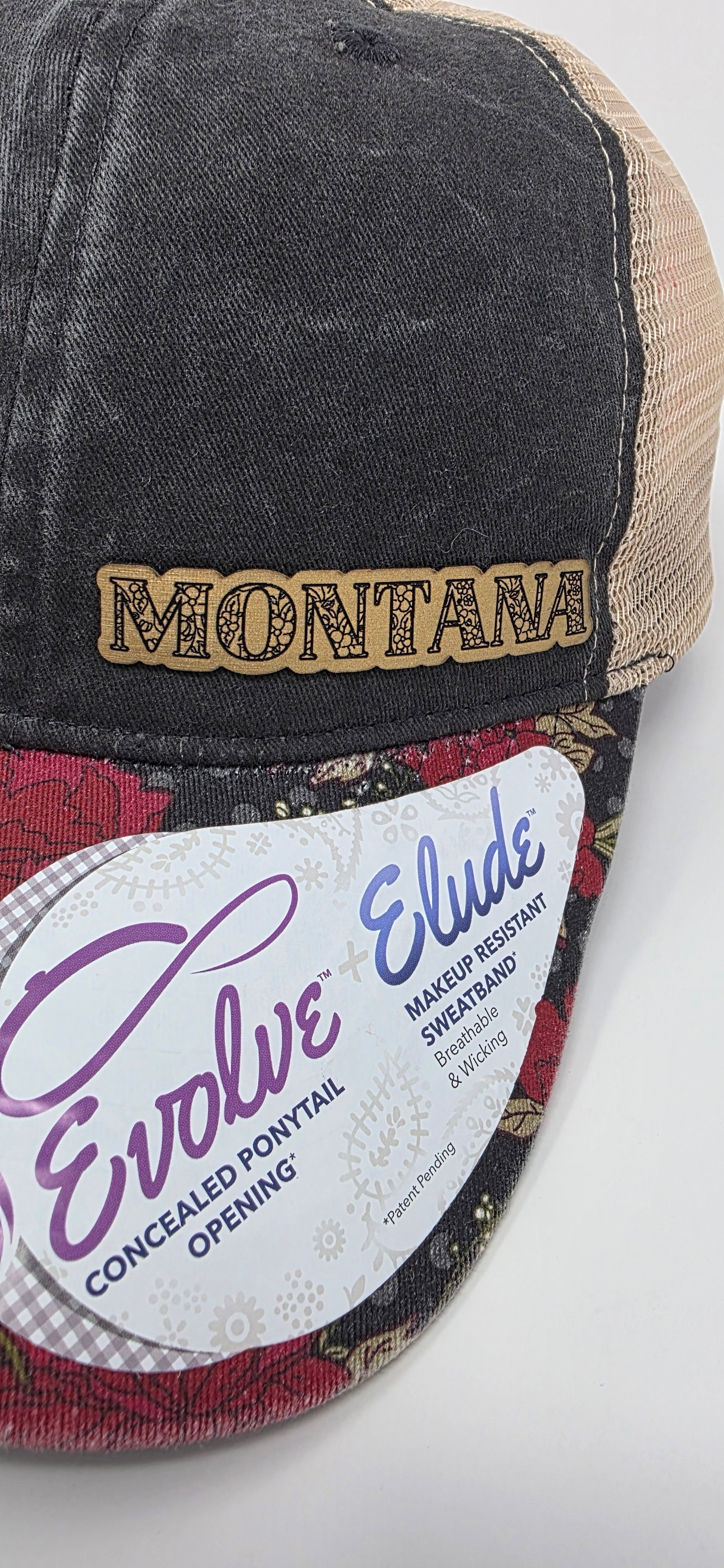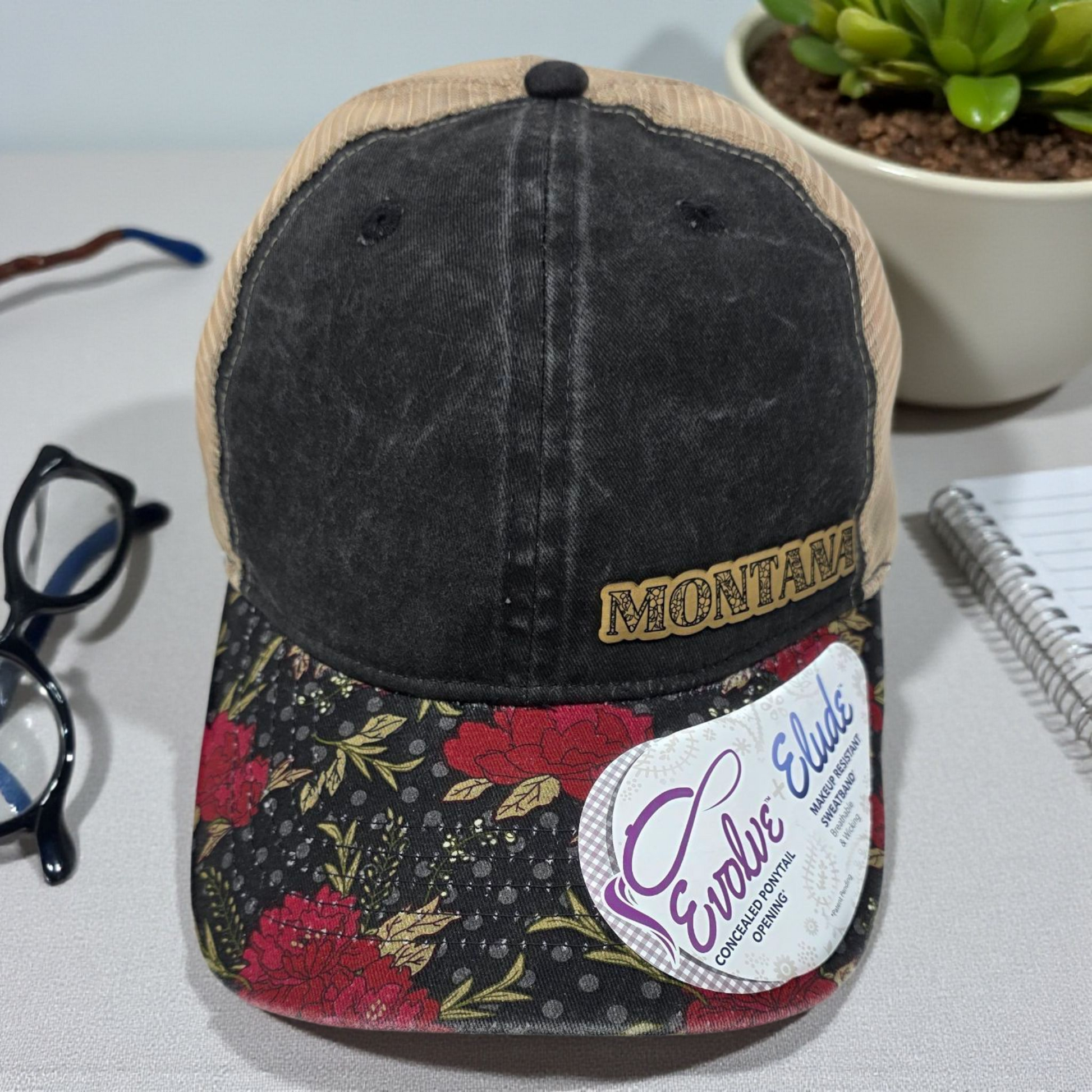 Discover the pigment-washed black twill Montana Hat, a perfect fusion of bold design and outdoor functionality. Featuring a sleek black front with a laser-engraved Montana patch for a touch of rustic charm, this hat showcases a vibrant flowery bill with intricate red and gold floral patterns. The breathable mesh back ensures comfort during long days in the sun, while the concealed ponytail opening adds versatility for any hairstyle. Ideal for hiking, exploring, or simply showcasing your Montana pride, this hat combines durability with a unique, nature-inspired aesthetic.