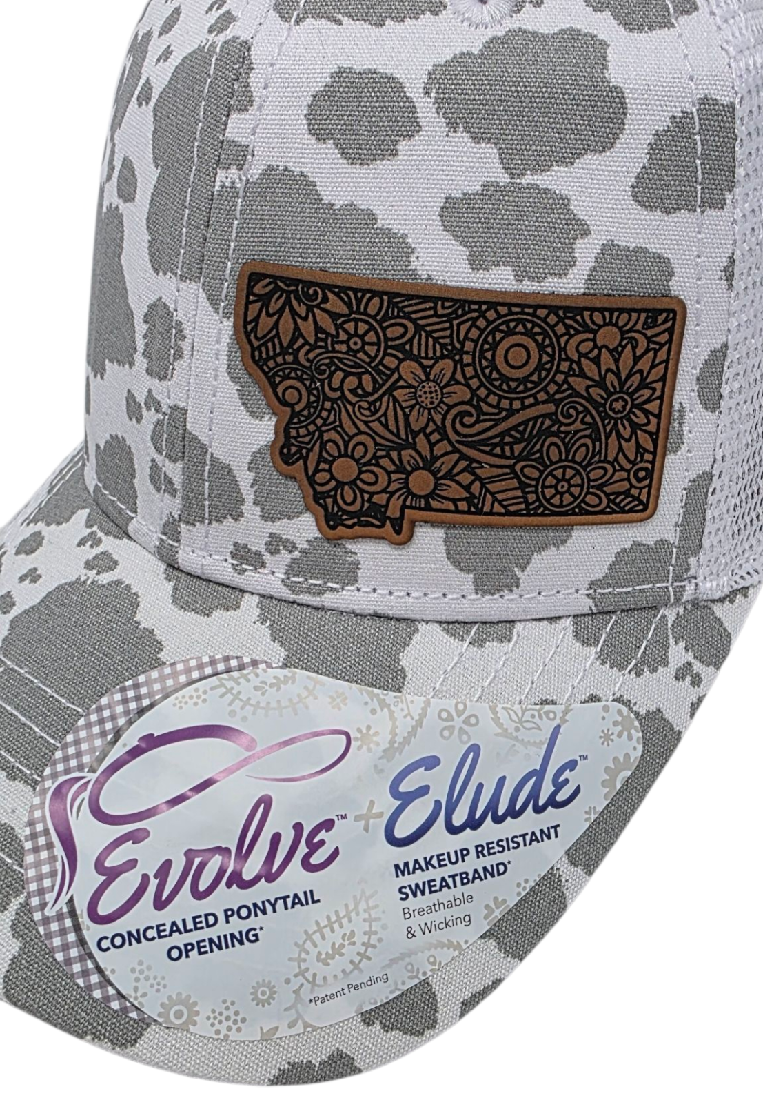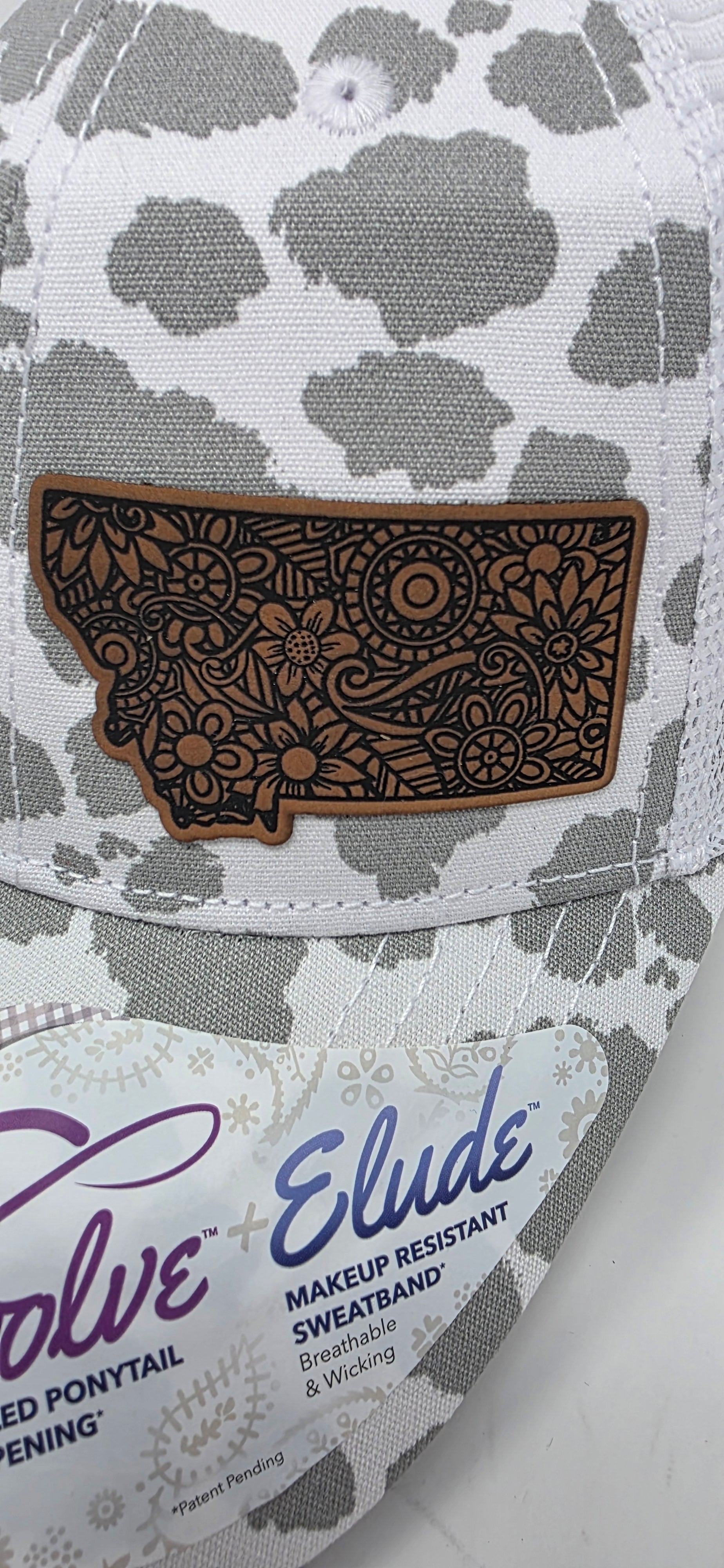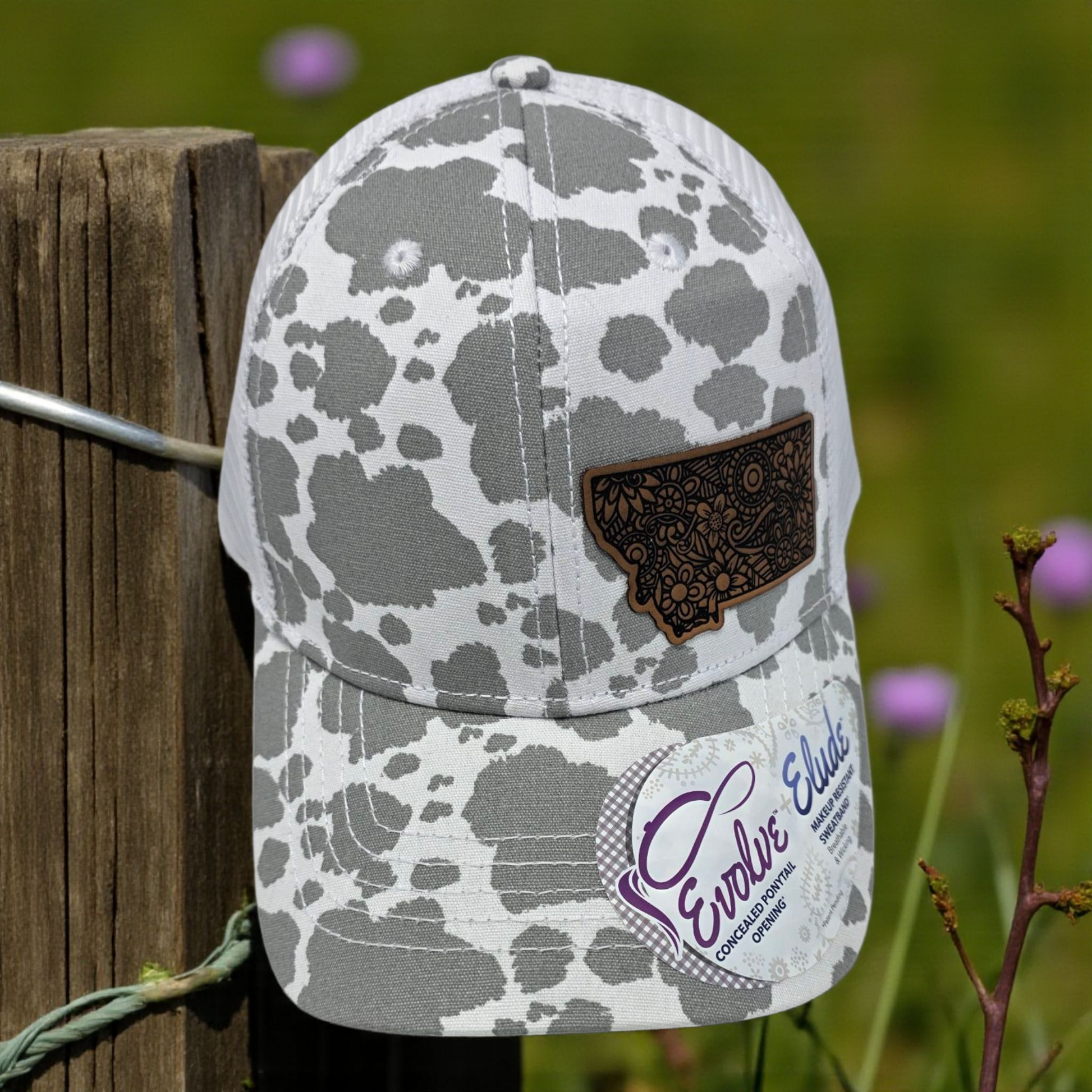 Elevate your style with our chic gray cow ball cap, designed exclusively for women! Featuring a convenient pony tail opening and a makeup-resistant band, this cap ensures comfort and practicality for all-day wear. The standout leatherette patch proudly displays the Montana-shaped patch with beautifully engraved flowery detail – adding a touch of rugged elegance. Perfect for outdoor adventures or casual outings, this cap blends fashion with functionality.
