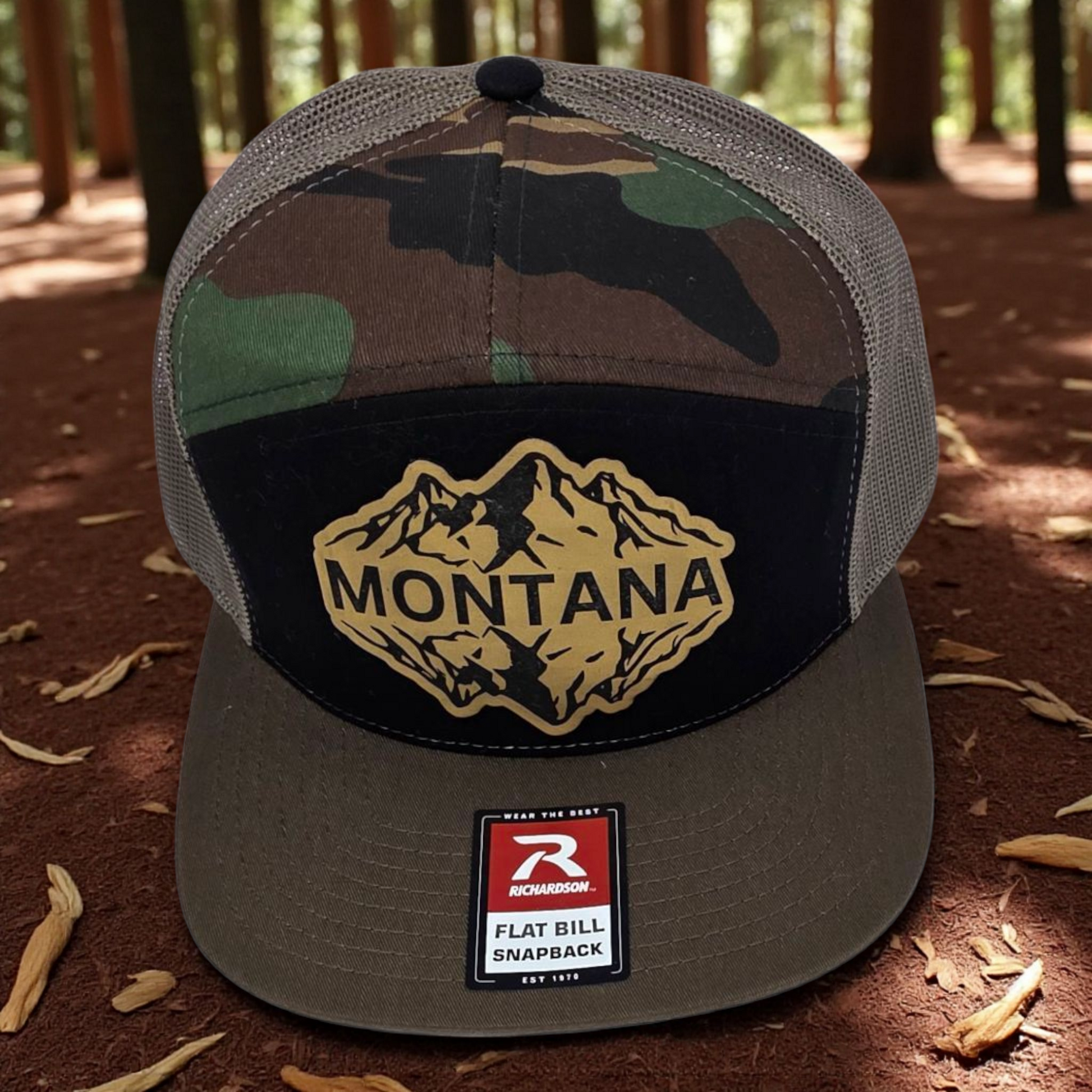 Embrace the spirit of the wild with this rugged flat bill snapback hat. Featuring a laser-engraved leather patch with a stunning Montana mountain reflection design, this hat captures the essence of the Big Sky Country. Crafted with a camouflage cotton front and a breathable mesh back, it offers durability and comfort for any outdoor adventure. Set against a breathtaking sunset backdrop, this Richardson flat bill snapback is a perfect blend of style and nature.