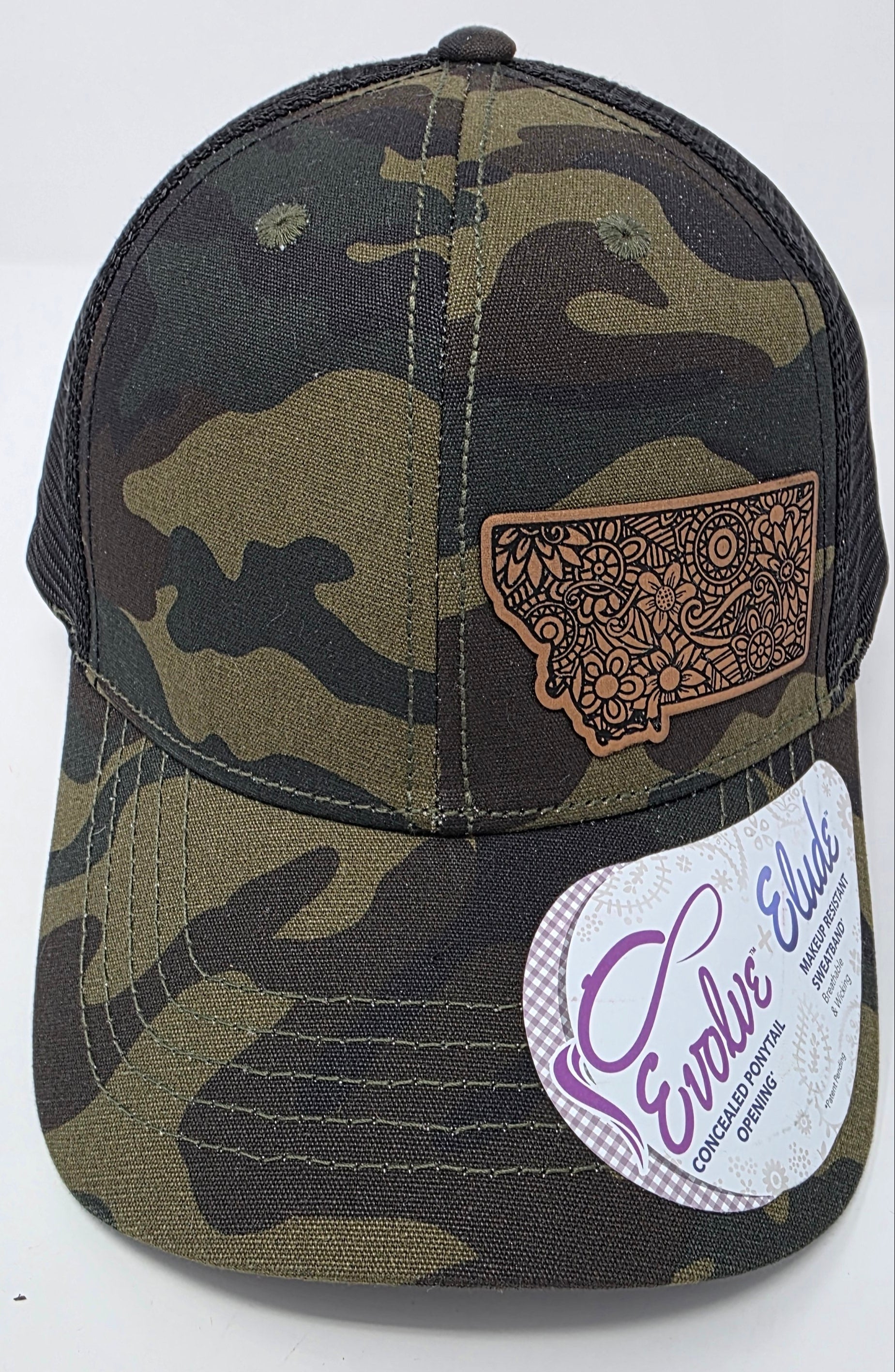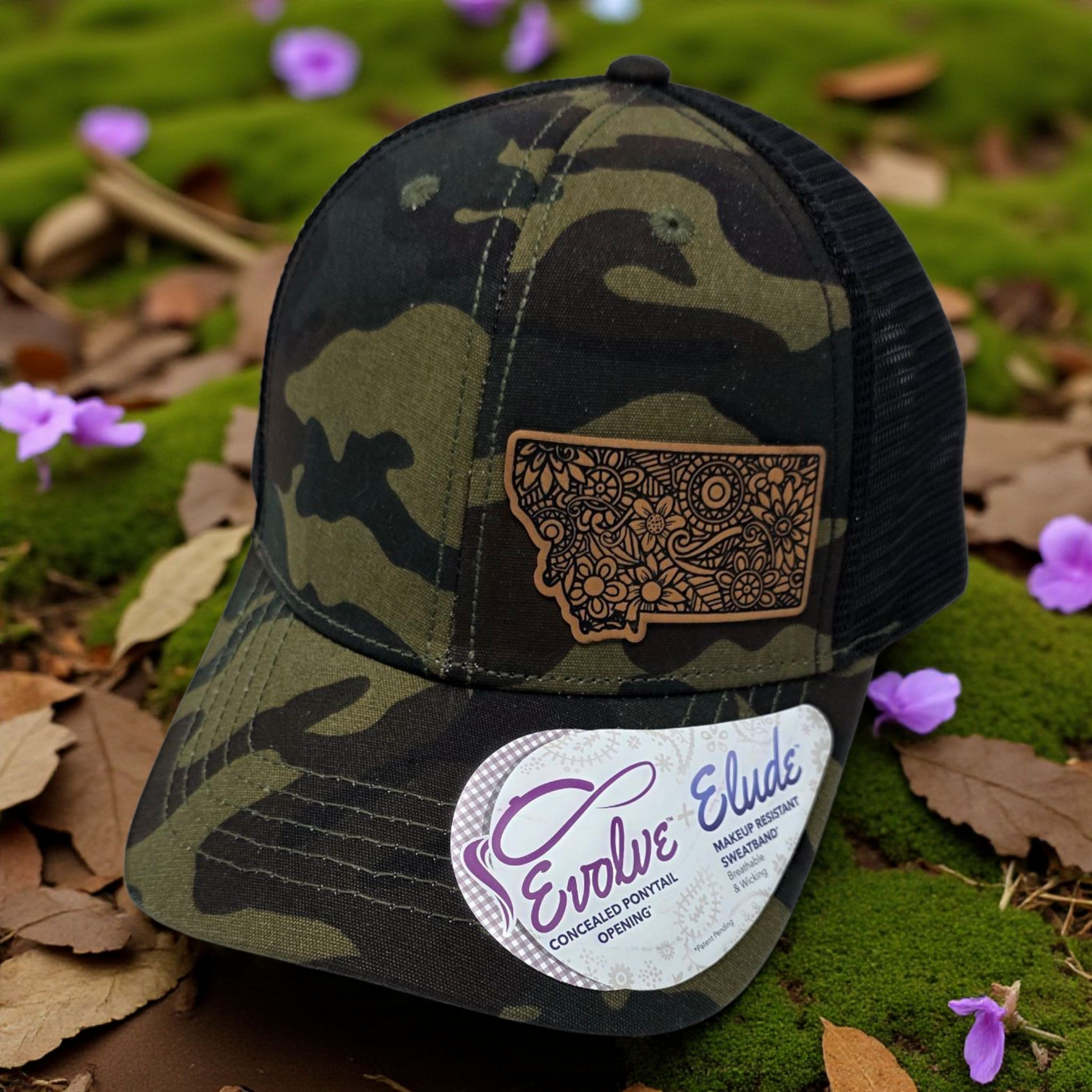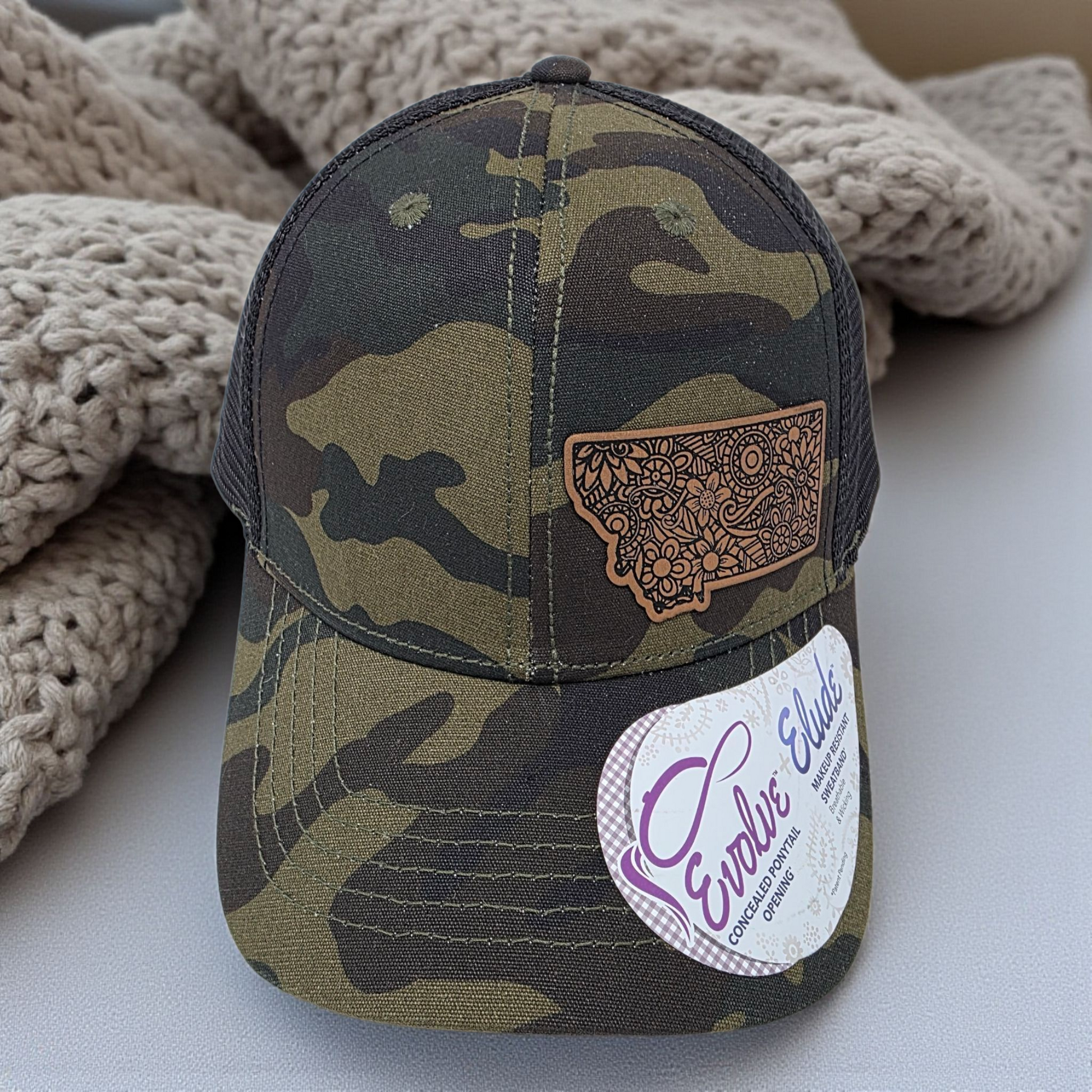 Elevate your style with our chic camo/black mesh ball cap, designed exclusively for women! Featuring a convenient pony tail opening and a makeup-resistant band, this cap ensures comfort and practicality for all-day wear. The standout leatherette patch proudly displays a MONTANA-shaped laser engraved patch with a detailed floral design – adding a touch of rugged elegance. Perfect for outdoor adventures or casual outings, this cap blends fashion with functionality.