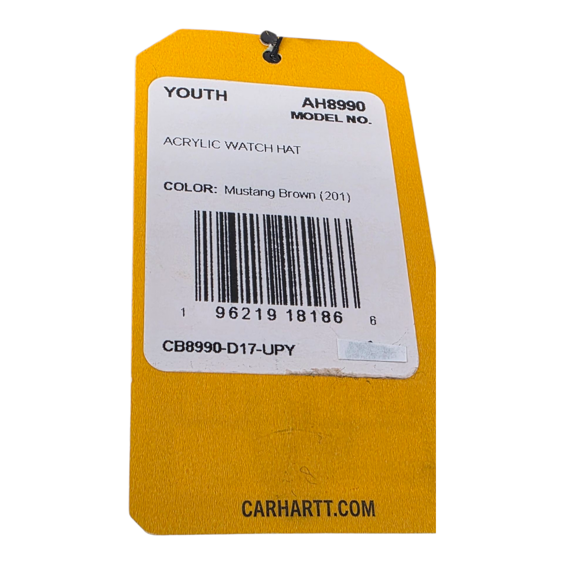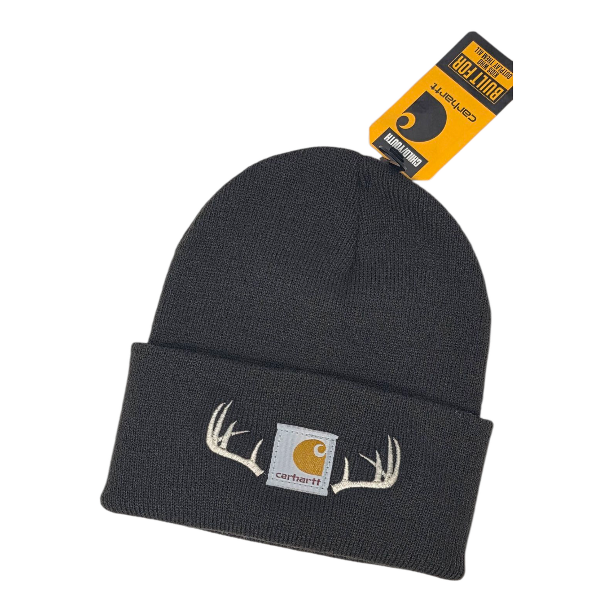 Carhartt YOUTH Acrylic Watch Hat embroidered with deer antlers on a mustang brown beanie for the little buck in the family. When the temperature turns chilly, keep them warm by giving them the proper head cover. This hat is constructed from 100% acrylic with a stretchable rib knit to fit a toddler’s head. The woven Carhartt® label on the front shows a commitment to quality outdoor and hunting gear.