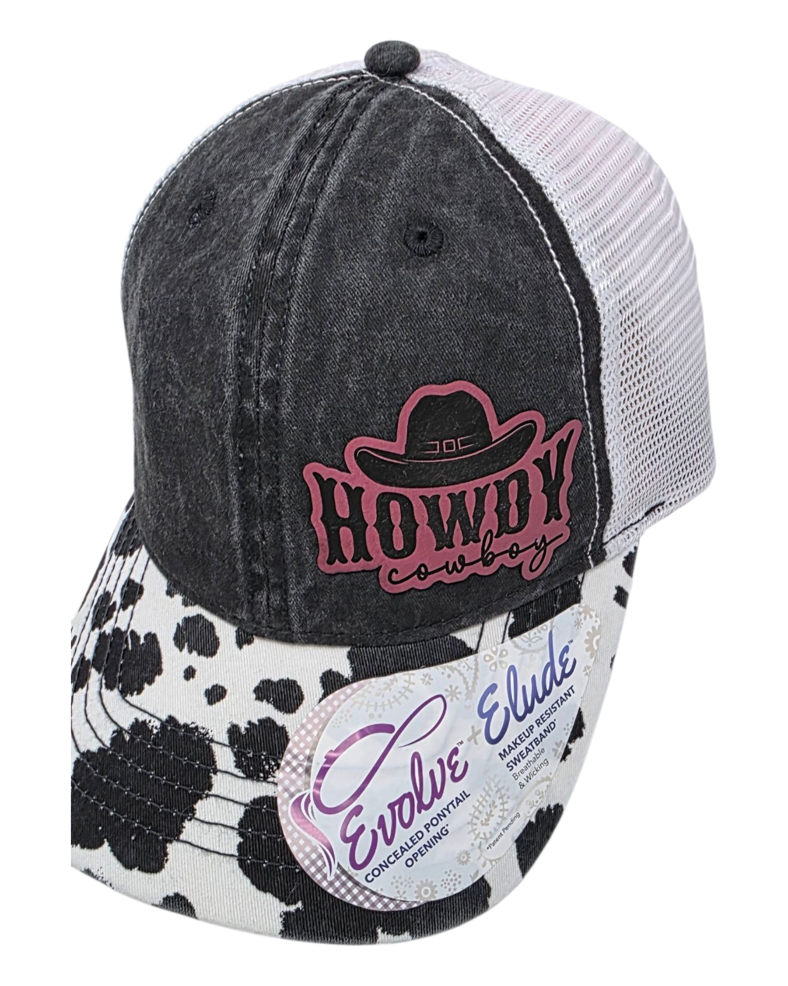 Bring a bold western vibe to your look with this cow print trucker hat featuring a striking laser-engraved "Howdy Cowboy" on pink leatherette. The distressed black front panel adds rugged character, while the white-and-black cowhide print brim keeps it fun and eye-catching. Finished with a breathable mesh back and adjustable fit, this hat is perfect for rodeos, ranch life, or simply showing off your country spirit in style.